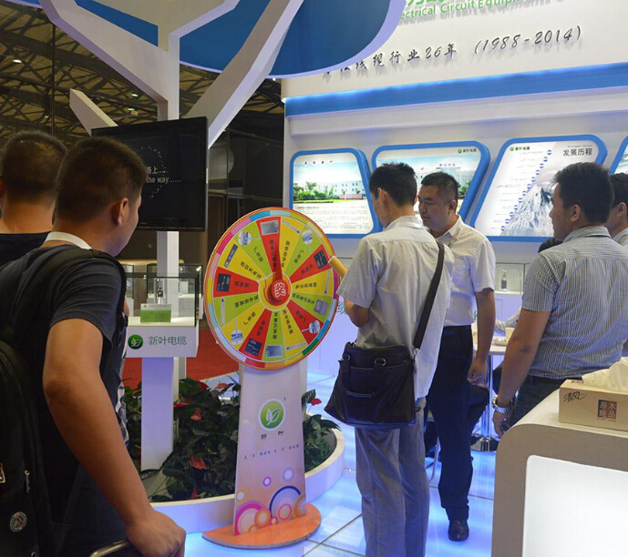我們公司占據(jù)的是W4線纜館的F01展區(qū)。首次亮相,便以清新的風(fēng)格、大方別致的造型贏得游客絡(luò)繹不絕,而旋轉(zhuǎn)的迷你展示臺(tái)、構(gòu)思巧妙的樹(shù)葉形企業(yè)LOGO牌,更是吸引了國(guó)內(nèi)、國(guó)際眾多參觀游客的駐足欣賞。本次展會(huì),公司與專(zhuān)業(yè)展臺(tái)設(shè)計(jì)商強(qiáng)強(qiáng)聯(lián)手,采用大面積LED燈箱及由數(shù)十組發(fā)光燈管組成的發(fā)光地臺(tái),把整個(gè)展區(qū)映照的璀璨奪目。而策劃獨(dú)到的掃公司二維碼、贏取轉(zhuǎn)盤(pán)搖獎(jiǎng)機(jī)會(huì)等活動(dòng),更將展會(huì)一次次推向高潮。